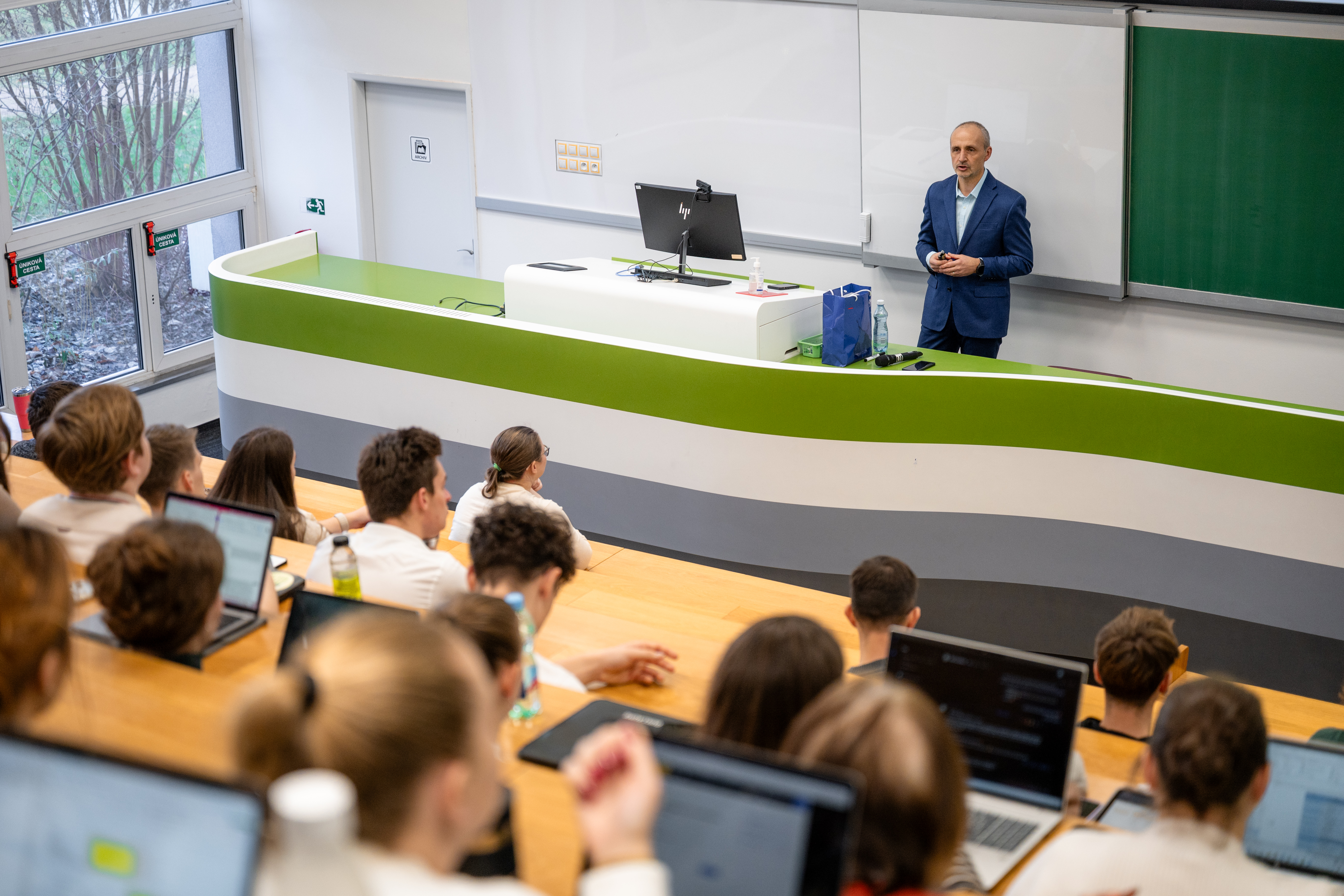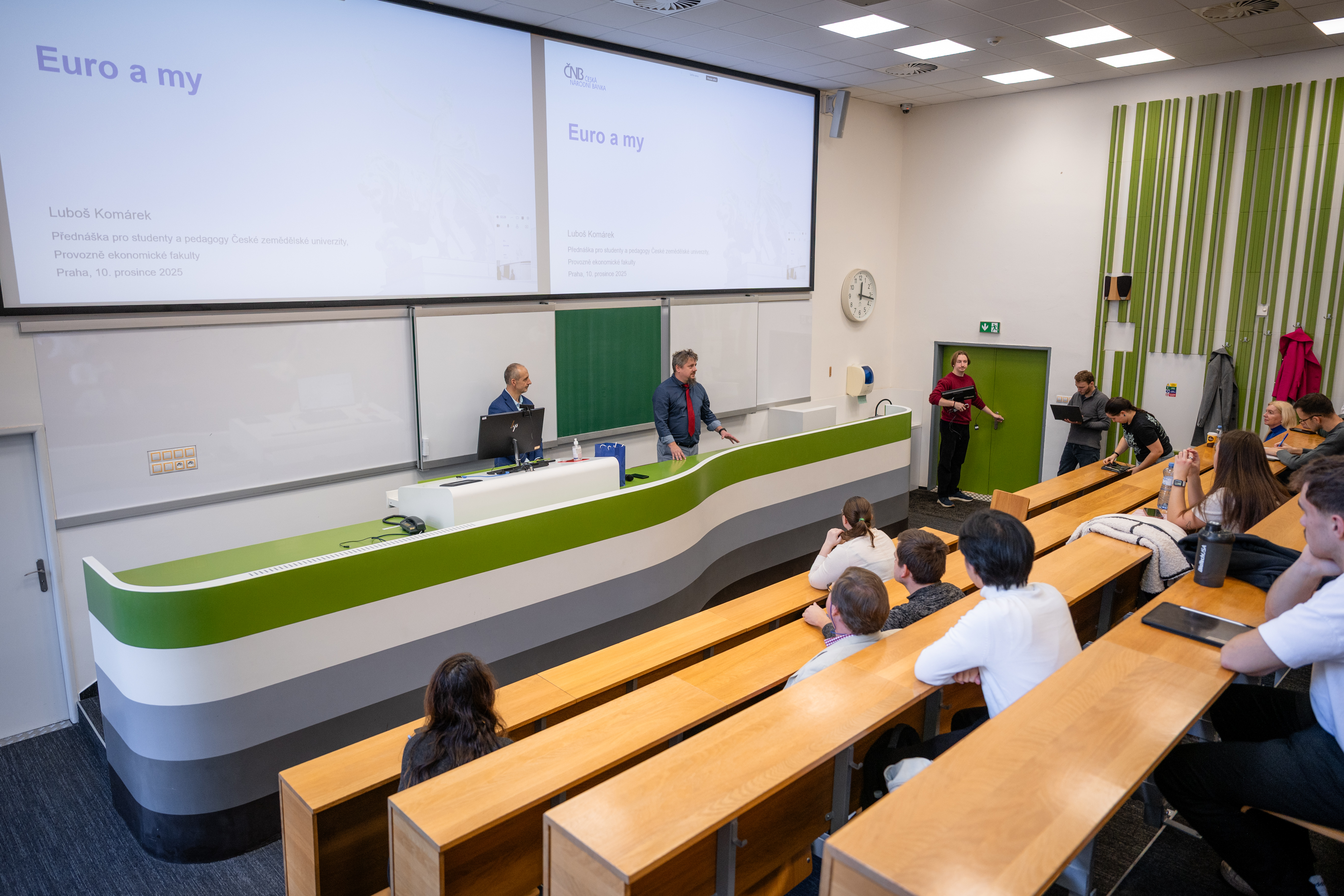 Ve středu 10. prosince 2025 byla v rámci předmětu Ekonomická analýza na PEF ČZU realizována exkluzivní zvaná přednáška na téma „Euro a my“, kterou vedl prof. Ing. et Ing. Luboš Komárek, Ph.D., MSc, MBA. Pan profesor Komárek patří mezi přední experty České národní banky v otázkách měnové politiky, současně zastupuje ČR v rámci Monetary Policy Committee a International Relations Committee Evropské centrální banky a nově je i členem Národní rozpočtové rady ČR. Přednáška se nejprve zabývala teoretickými aspekty vstupu ČR do Eurozóny a spojených kritérií pro přijetí společné měny. Následně byla prezentována reálná analýza souvisejících ukazatelů a pozice ČR v mezinárodní komparaci včetně predikce možných dopadů na dílčí subjekty v ekonomickém prostředí. Přednášku pan profesor Komárek uzavřel diskusí nad rozdílnou dynamikou regulačních zásahů ECB v porovnání s ČNB. Souhrnně lze konstatovat, že přednáška měla vysoký znalostní standard, profesionální přístup a pro studenty i potenciál značné přidané hodnoty poznatků z reálné praxe.
