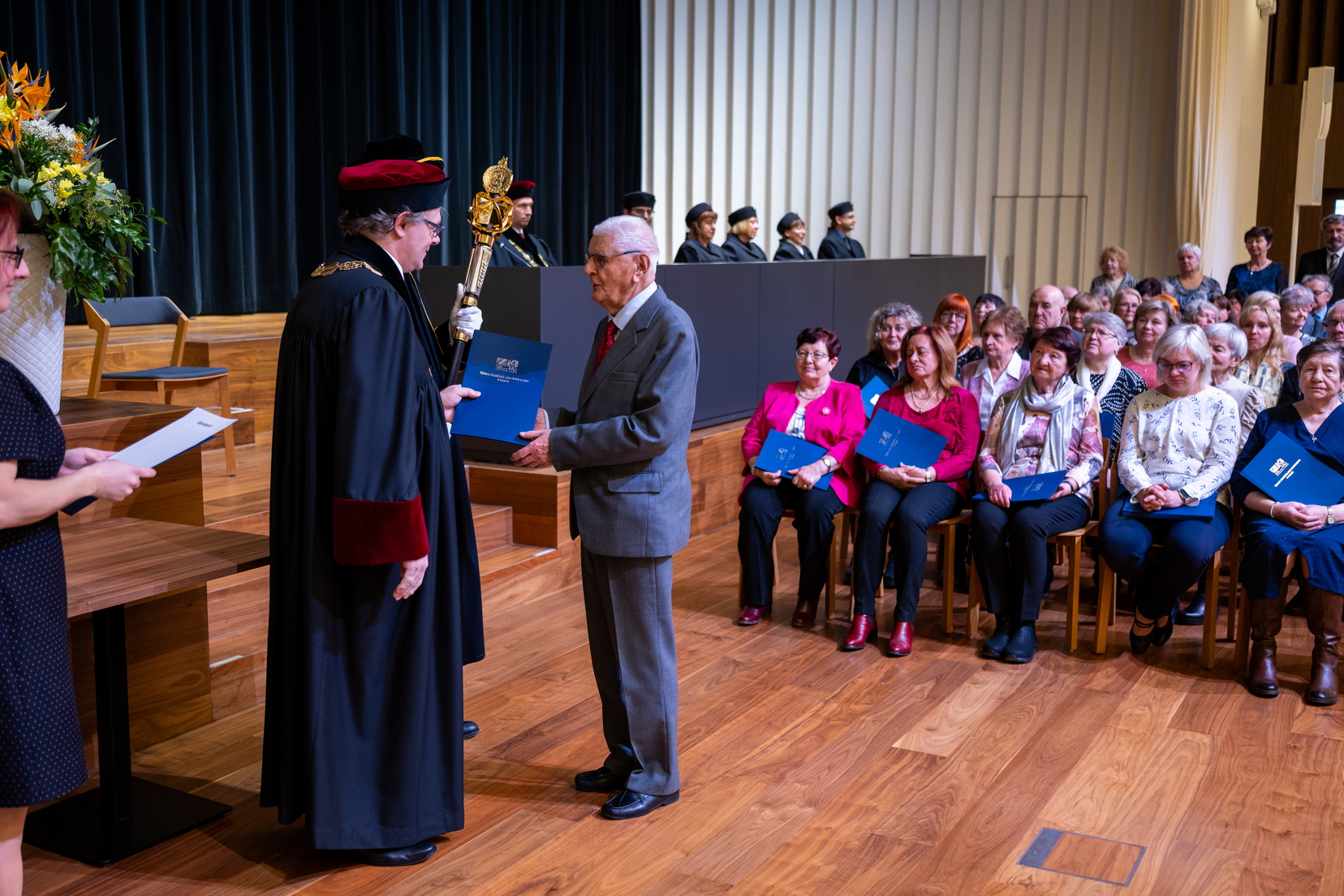 Ve dnech 20. a 21. ledna 2026 se v Aule České zemědělské univerzity v Praze uskutečnily promoce Virtuální univerzity třetího věku Provozně ekonomické fakulty. V zimním semestru akademického roku 2025/2026 ukončilo studijní program Svět okolo nás celkem 1 214 posluchačů, z nichž si Osvědčení o absolutoriu přijela převzít zhruba polovina. Promoce se konaly ve třech termínech za účasti absolventů ze 100 konzultačních středisek z celé České republiky. Mezi nimi byl také třetí nejdříve narozený posluchač Virtuální U3V, pan Čestmír Kotek z Třeboně, který v listopadu oslavil krásné 98. narozeniny. Všem absolventům srdečně blahopřejeme.
